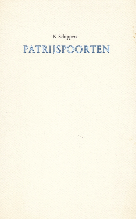 13. SCHIPPERS, K. Patrijspoorten. (Met mooie opdracht van de auteur aan zijn echtgenote). Woubrugge, Avalon Pers, (1992). Ingenaaid met omslag. (20) p. Gezet uit de Romulus en gedrukt op Zerkall-Bütten in een oplage van 81 genummerde en door de auteur gesigneerde exemplaren.