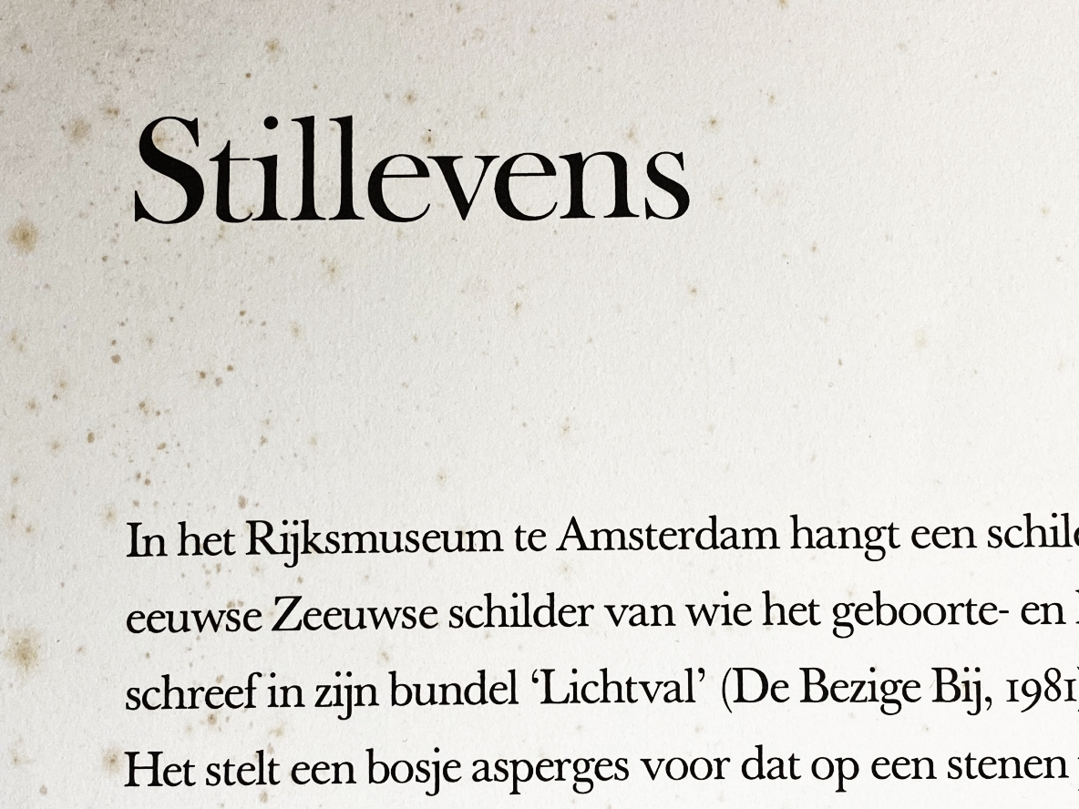 * Beschouwing over een aspergestilleven van Adriaen Coorte in het Rijksmuseum, later opgenomen in de bundel Andermans wegen (2020). Onderaan gesigneerd in potlood door de auteur.