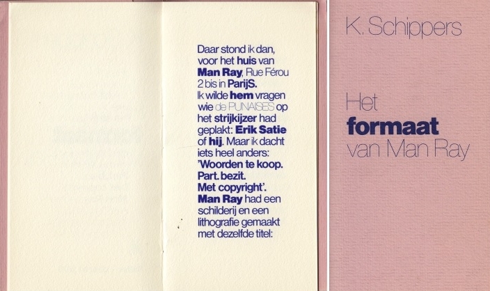 3. SCHIPPERS, K. Het formaat van Man Ray. Utrecht, Reflex/Salix Alba, (1979). Geniet in omslag. (12) p. 1e handelseditie (= eerste druk in handzaam formaat. Deze uitgave verscheen eerder in een oplage van 12 exemplaren als bibliofiele reuzenuitgave van 150 x 67 cm. Daar is deze uitgave (8,3 x 15 cm) een lilliputter bij).