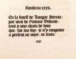 * Prachtige typografie in deze mooie, luxe uitgave van de liederen van de prins van Orléans, die na de slag bij Agincourt (1415) door de Engelsen gevangen werd genomen en pas een kwart eeuw later werd vrijgelaten. Hella Haasse schreef over de koninklijke dichter Het woud der verwachting.