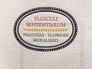 * Een groot genot voor de typografieminnaar, een orgie van typografische vignetten en initialen uit de collectie van de Amerikaanse typograaf Bruce Rogers, speels in exquisiete harmonie vormgegeven door de beeldhouwer en graficus Leonard Baskin (1922-2000) en uitgevoerd door zijn ‘pressman’ Harold McGrath op de versatiele Gehenna Press in het Massachusettse Northampton. Achterin een fantastisch gestyleerde, feestelijke toelichting van de boekgeleerde Dale R. Roylance. Dit uiterst begerenswaardige boek komt uit de collectie van Huib van Krimpen. De titel ‘Flosculi Sententiarum’ betekent letterlijk ‘bloemetjes van de zinspreuken’ of van de wijsheid. En kleurige, geestrijke bloemen, dat zijn het.