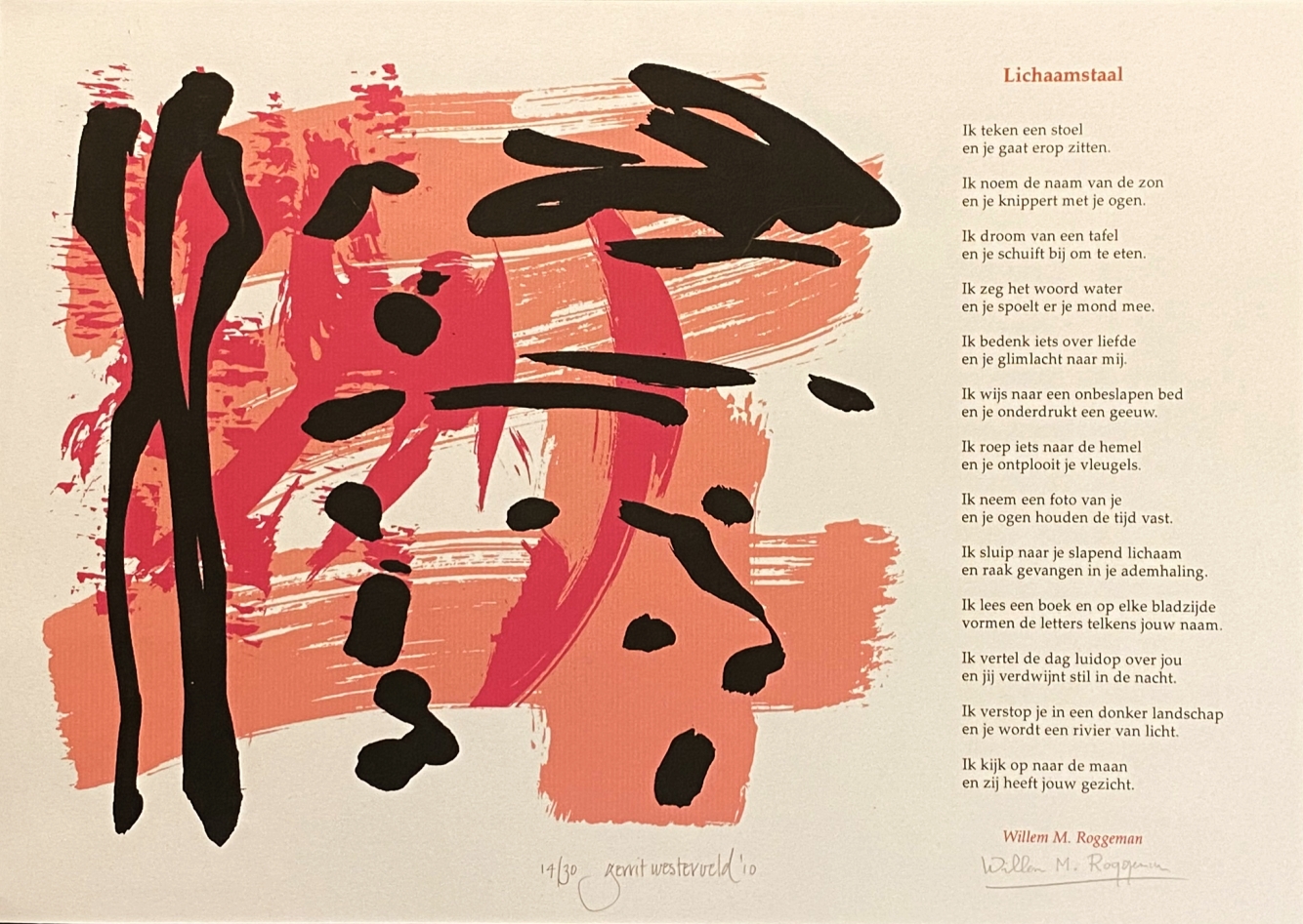 43. ROGGEMAN, Willem M. Lichaamstaal. (Met een originele inkjetprent in kleur van Gerrit Westerveld). [Bergen op Zoom, Kleinood & Grootzeer], 2010. Planodruk. 29,5 x 41,6 cm. Gedrukt in een oplage van 30 genummerde en door dichter en kunstenaar gesigneerde exemplaren. 1e druk.