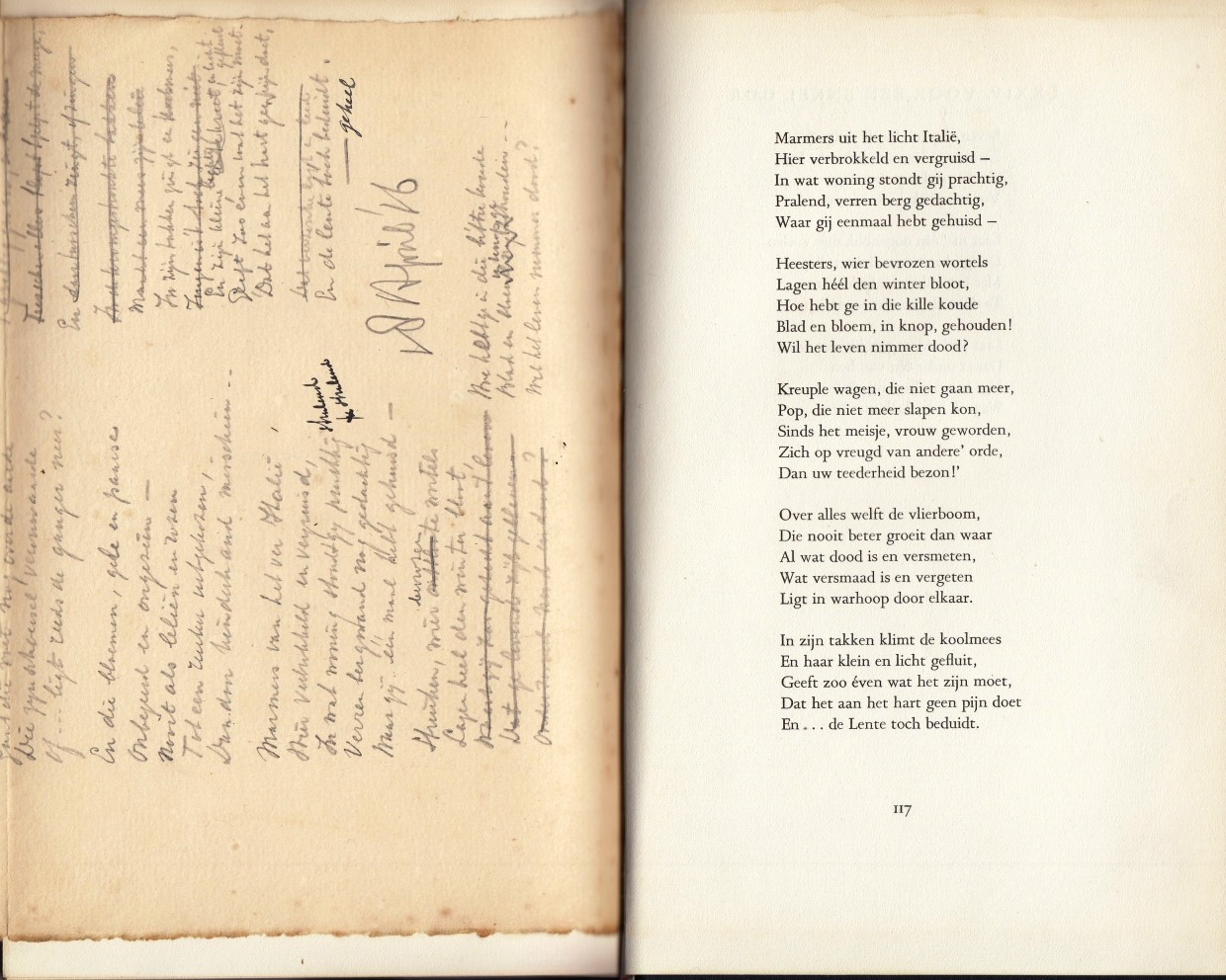 * Getruffeerd! Aan dit exemplaar werden op vier plaatsen de originele (klad)handschriften van Bastiaanse ingeplakt, gedateerd 1899, 1912 en 1946. Het betreft de gedichten op de pagina’s 18 en 19, 20, 71, 116 en 117: ‘In alle getijden’, ‘Bekentenis’, ‘De veerpont’ en ‘ Het vaaltje’.