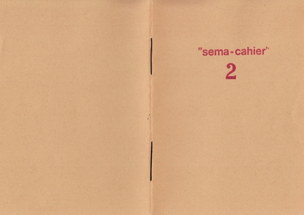 2. “sema-cahier” 2. Onderzoek. Bekentenis-schrift. Cahiersteek. (8) p. Kleurenstempeldrukken met handgeschreven tekst in potlood. Vervaardigd in een oplage van 12 genummerde en gesigneerde exemplaren.