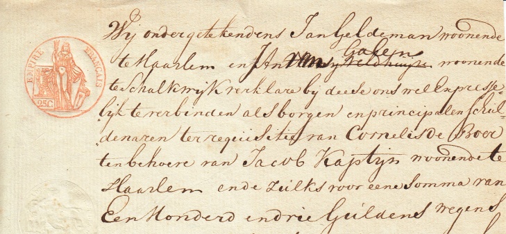 * Ondergetekenden verklaren in de meest ingewikkelde en geleerde klerkenzinsneden garant te staan voor Kaptijns aankoop van een ‘koebeest’ ‘aannemende mitsdien om bij aldien gemelde persoon mogt koomen te mangileeren’. Onderaan staat droogjes over betreffende ondergetekenden vermeld ‘verklarende Jan Gelderman en Jan van Galen niet te kunnen schrijven’.