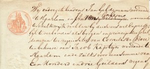 30. KOEBEEST Overeenkomst gesloten te Bloemendaal tussen Jan Gelderman, Jan van Galen, Cornelis de Boer en Jacob Kaptijn op 2 oktober 1825. Met de hand geschreven officieel document op officieel Frans regeringspapier (watermerk) met rood- en blindstempel van het Empire Française. 18 regels.
