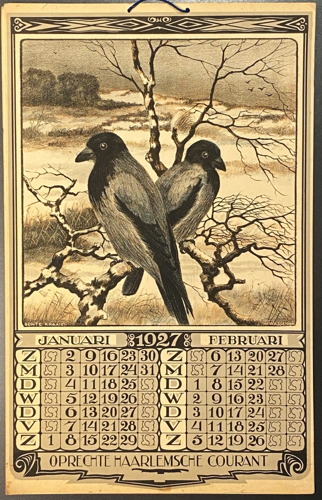 49. WASSENAAR, Willem Kalender 1927. [Haarlem], Oprechte Haarlemsche Courant, [1926]. 40 x 26 cm. Zes eenzijdig bedrukte bladen met sierkoord. Zes litho’s van vogels: bonte kraaien, eksters, scholeksters, eenden, een uil en zwarte kraaien, boven dubbele maand met getekende letters en cijfers en grijze steunkleur. Enkele kleine vlekjes.