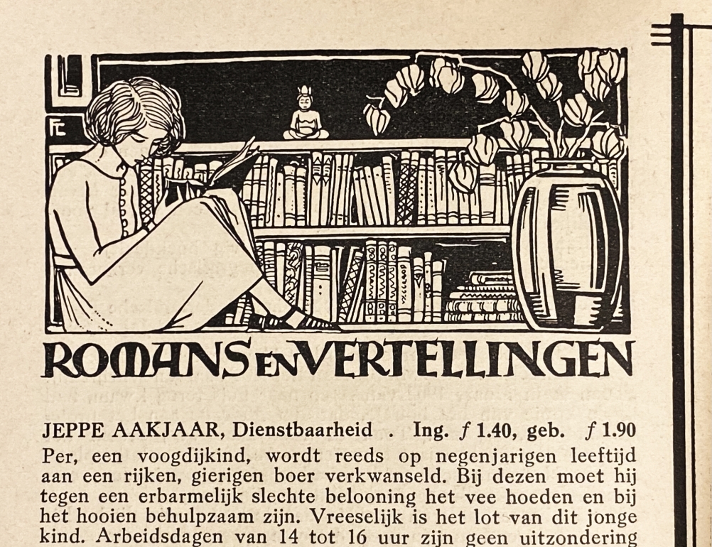 * De allereerste fondscatalogus van De Arbeiderspers, de uitgeverij die in 1929 werd opgericht voor de socialistische ‘zuil’ als opvolger van uitgeverij Ontwikkeling. Opvallend zijn de vele vignetten die als hoofdstuktitels dienen, sierlijke art-decotekeningen met sterke zwart-witwerking. Bijna allemaal voorzien van Fré Cohens vertrouwde ‘FC’. Niet in de NCC of in Cat. Fré Cohen.