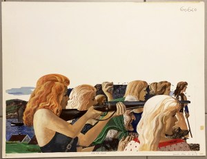 * Originele gouache als illustratie bij een onbekend boek of verhaal in dit boekenclubtijdschrift. Een sfeervolle kleurentekening van een groep vrouwen die dreigt naar iets aan de rechterkant, buiten beeld. Een opvallende roodharige vrouw schoudert een geweer, een gaat een steen gooien, een bejaarde knarst de tanden, de anderen schreeuwen, de hond blaft. Op de achtergrond een rotsachtige kust, is het Ierland? Noorwegen?
