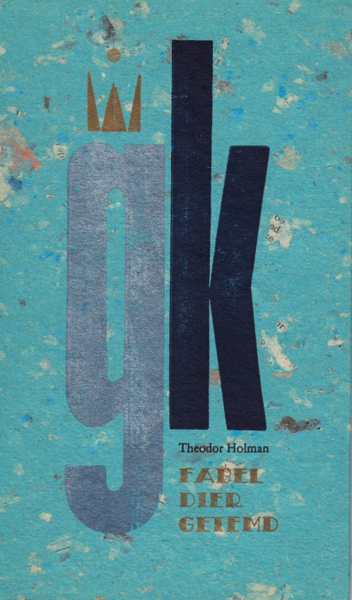 12. HOLMAN, Theodor Fabeldier getemd. Utrecht, (Bucheliuspers), 2001. Ingenaaid met stofomslag. (12) p. Met de hand gezet uit de Garamont en gedrukt in goud, lichtblauw, donkerblauw en zwart in een oplage van 50 exemplaren. 1e druk.