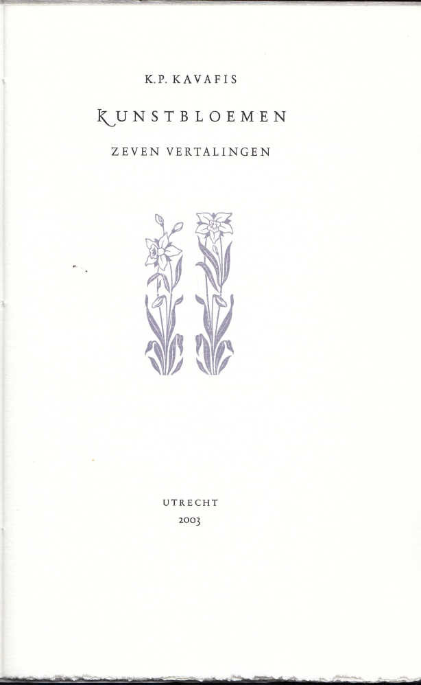 37. KAVAFIS, K.P. Kunstbloemen. Zeven vertalingen. Utrecht, [Hugin & Munin/ Hinderickx & Winderickx], 2003. Cahiersteek. (20) p. Met de hand gezet uit de Antigone, de Romanée en een cyrillische letter en gedrukt in blauw en zwart op Zerkall-Bütten in een oplage van 72 exemplaren. 1e druk.