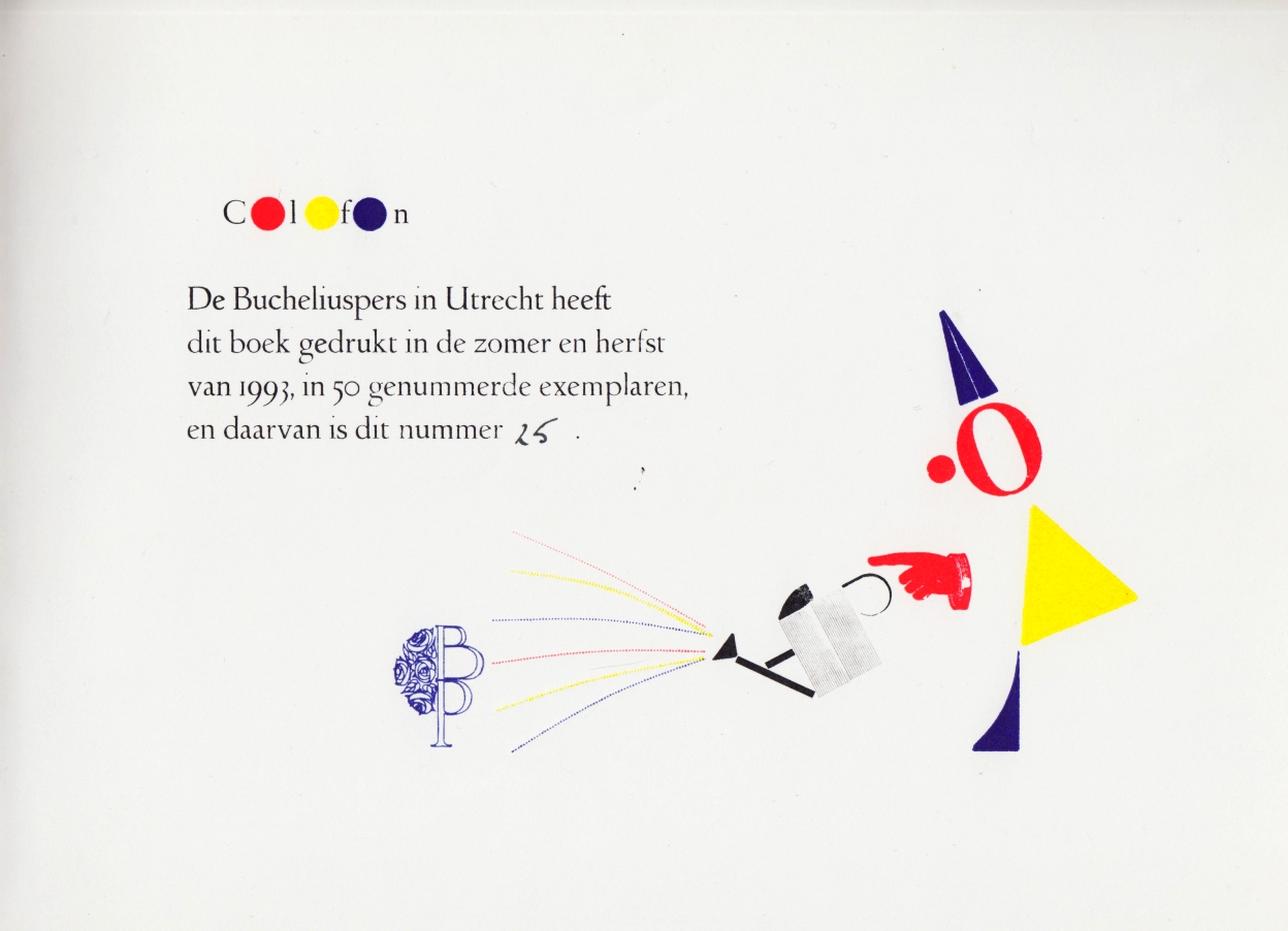 13. HOLMAN, Theodor Holmans Grepen uit de Wereldliteratuur. Met medeweten van Kees A., Jan K. (en) Jan Willem S. (Met tien ingeplakte typografische ‘portretjes’). Utrecht, De Bucheliuspers, 1995. Ingenaaid met omslag. 20 p. Ingeplakte portretten van auteurs in zetmateriaal, gedrukt in rood, blauw, geel en zwart! Met de hand gezet en gedrukt in een oplage van ‘rond de zestig exemplaren’. 1e druk.