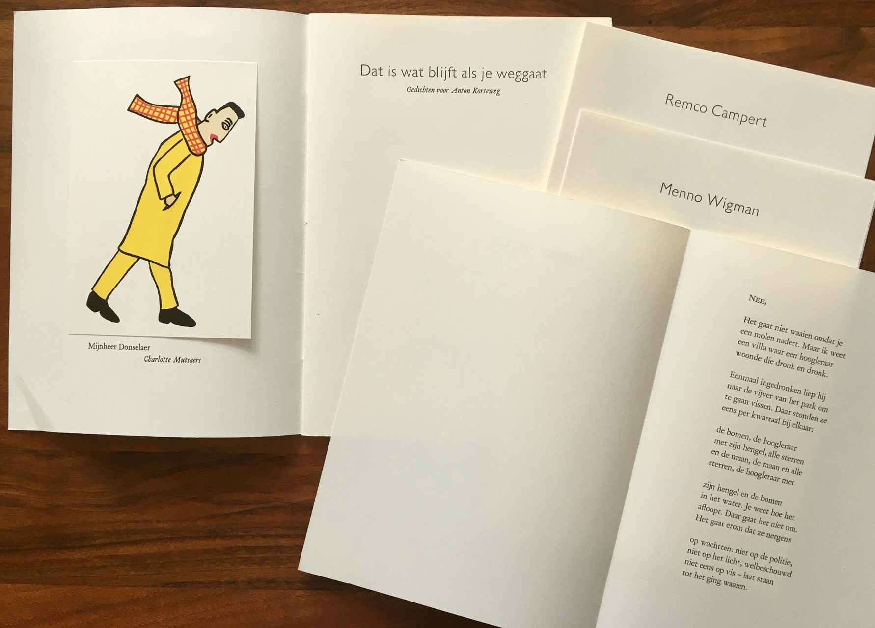 29. (KORTEWEG, Anton) Dat is wat blijft als je weggaat. Gedichten voor Anton Korteweg. Den Haag, Letterkundig Museum, 2009. 63 dubbelbladen + (12) p. cahiersteek in moiré linnen doos (Frans den Breejen). Met de hand gezet uit de Van Dijck en de Gill en gedrukt door De Uitvreter op Velata Avorio Biblos-papier in een oplage van 110 exemplaren. Kleine deukjes op de rand van de doos.