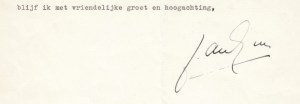 * De psycholoog J.E. de Quay (1901-1985) was in de oorlog een omstreden politicus geweest, maar in 1946 werd hij, gezuiverd van blaam, commissaris van de Koningin in Brabant. Toen de KVP in 1959 de grootste partij werd, kreeg hij het verzoek minister-president te worden. Deze brief dateert uit de voorbereidingstijd van zijn kabinet: ‘Met spanning samen gebracht, en dan weer uit elkaar geslagen, zonder zelfs de gelegenheid te hebben elkaar ten afscheid de hand te reiken.’ Kennelijk was de formatie mislukt; ook de ondertekening duidt niet op succes: ‘In de hoop, dat het goede vaderland op een andere wijze uit de moeilijkheden wordt geholpen, in de hoop ook U zo nu en dan eens weer te zien, verblijf ik met vriendelijke groet en hoogachting,/ J. de Quay.’ Drie weken later trad het kabinet-De Quay aan, met Sidney van den Bergh als minister van Defensie. De beëdiging geschiedde op 19 mei 1959.