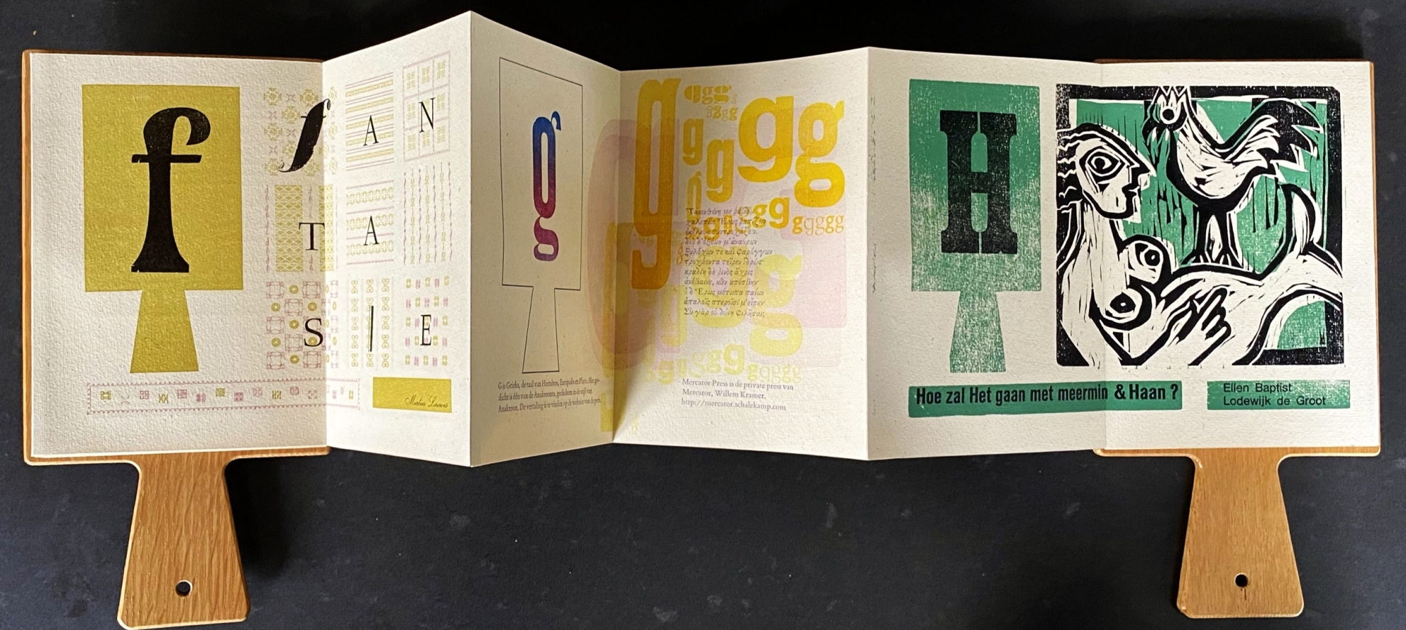 De leporello vormt het daardwerkelijke abecedarium (recto A tot en met M, verso N tot en met Z) en werd gedrukt door De Baaierd, de BY-pers (een gelegenheidsinitiatief van Dick Wessels en Ferrie van Ramele; twee bijdragen: de B en de Y), De Vier Seizoenen, Op gezette tijden (twee bijdragen: de D en de W), Ogentroost (twee bijdragen: de E en de V), Marlies Louwes, Mercator Press, Ellen Baptist & Lodewijk de Groot (twee bijdragen: de H en de S), [Tussen Haakjes], Rootvoet Pers, De vergulde maatlat/Treemapers, De Prent, Avalon Pers; Eendracht Pers, Triona Pers, De Zwaluw, De Zolderpers, Atelier GrotesQue, Typografiek, Helicon-Pers, Antje Veldstra en De Overkant.