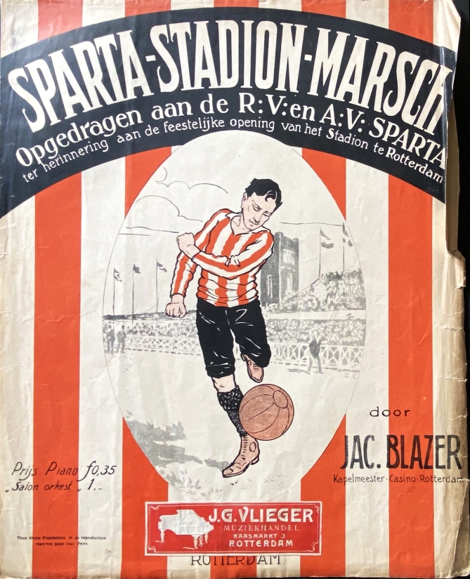 6. BLAZER, Jac. Sparta-Stadion-Marsch. Opgedragen aan de R:V: en A:V: Sparta ter herinnering aan de feestelijke opening van het Stadion te Rotterdam. Rotterdam, Ph. Hakkert Jr., met opgeplakt etiket van J.G. Vlieger, (ca. 1921). 33 x 26 cm. Vouwblad. Omslagontwerp gesigneerd D.C. (= D. Coene). Partituur voor piano met alleen refreintekst (‘Naar het Sta-di-on’). Matige staat: wat verkleurd en gevlekt. Zijkant gerafeld en verbruind.