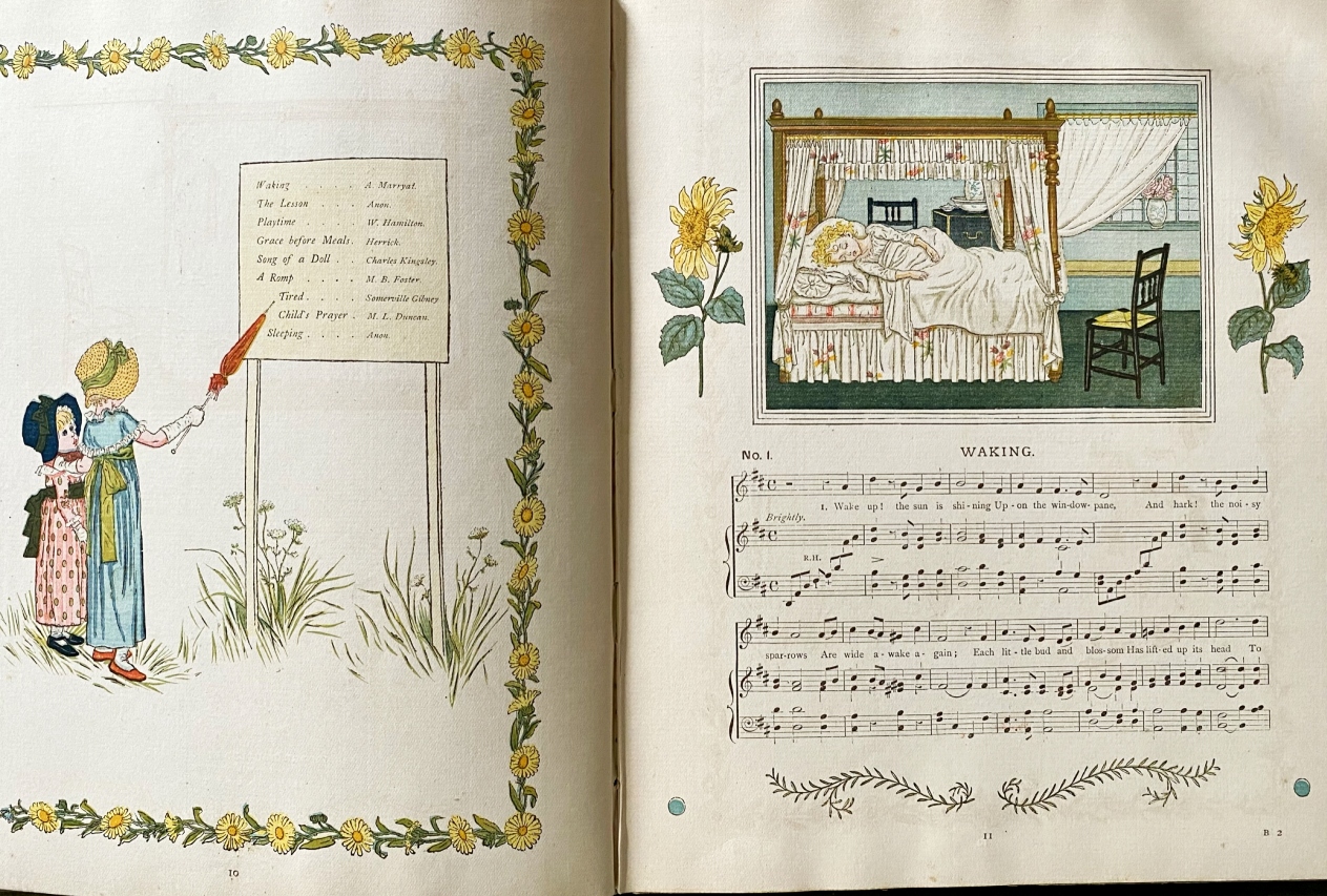 19. GREENAWAY, Kate A Day in a Child’s Life. Illustrated by Kate Greenaway. Music by Myles B. Foster (Organist of the Foundling Hospital). Engraved and printed by Edmund Evans. London, Routledge & Sons, [1881]. Lichtgroen halflinnen met versierde papieren platten en afgeschuinde randen. Grasgroene schutbladen. 32 p. Liedjes met notenschrift, geheel in kleuren geïllustreerd met afbeeldingen van kleine kinderen en bloemen.