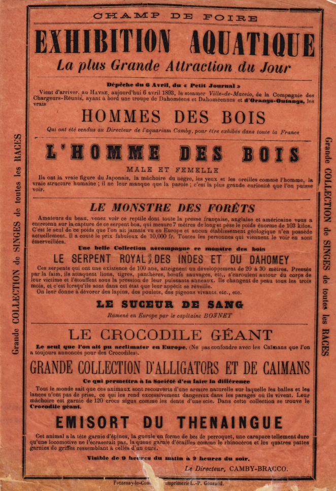 * Uiterst zeldzaam, nee, onvindbaar origineel affiche voor de tentoonstelling op de kermis van Le Havre, van allerlei ‘bosmensen, een mannetje en een vrouwtje’, wonderbeesten en monsters: een boa van 103 kilo, een ‘Grande Collection de Singes de toutes les Races’, alligators en kaaimannen.