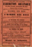 23. KERMIS Exhibition aquatique. La plus Grande Attraction du Jour. L’Homme des Bois, Le Monstre des Forêts, Le Serpent Royal des Indes et du Dahomey, Le Suceur du Sang, Le Crocodile Géant. (Reclameposter voor het Aquarium Camby, Le Havre, april 1893). Le Havre, Camby-Bracco, 1893. 29 x 20 cm. Gedrukt op heel dun oranje papier, eenzijdig. Aan de onderkant beschadigd en met papier verstevigd, verder mooi.
