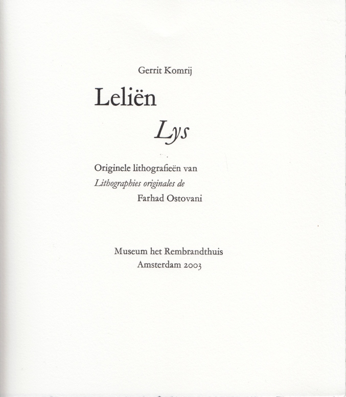 10. KOMRIJ, Gerrit Leliën (Lys). (8) originele lithografieën van (Lithographies originales de) Farhad Ostovani. Amsterdam, Museum het Rembrandthuis, 2003. 26 x 23 cm. Tien vouwbladen los in omslag. In kartonnen cassette. Met de hand gezet uit de Garamond en gedrukt op de persen van Alex Barbaix in een oplage van 130 genummerde en door auteur en kunstenaar gesigneerde exemplaren. 1e druk.