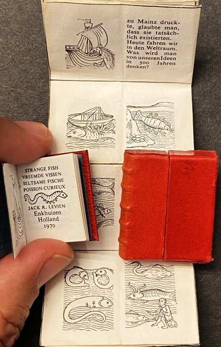 * Leuk ieniemienieboekje met 15e-eeuwse plaatjes van gekke vissen, vervaardigd door de geboren Amerikaan Jack Levien. Deze effectenhandelaar woonde rond 1970 een paar jaar in Enkhuizen en liet in 1970-1972 een stuk of dertig zeer minuscule boekjes in Nederland vervaardigen, nadat hij daar al in 1967 in New York mee begonnen was.