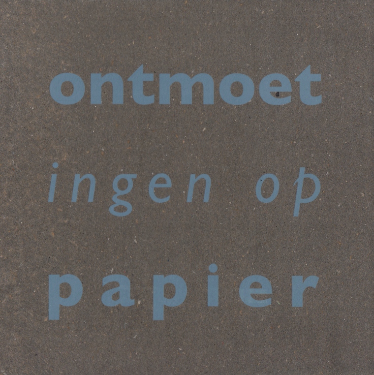 5. (GRAFISCH CENTRUM GRONINGEN) Ontmoetingen op papier (Groningen, Grafisch Centrum), 2012. Ingenaaid (open rug) met kartonnen platten. Met bijdragen van 29 drukkers. Uitgegeven naar vormgeving (en bindwerk) van Hanneke Briër, Hans Horn, Maiki Mijnssen, Pien Rotterdam en Anneke de Vries in een oplage van 50 exemplaren. DIDM projecten G-15.