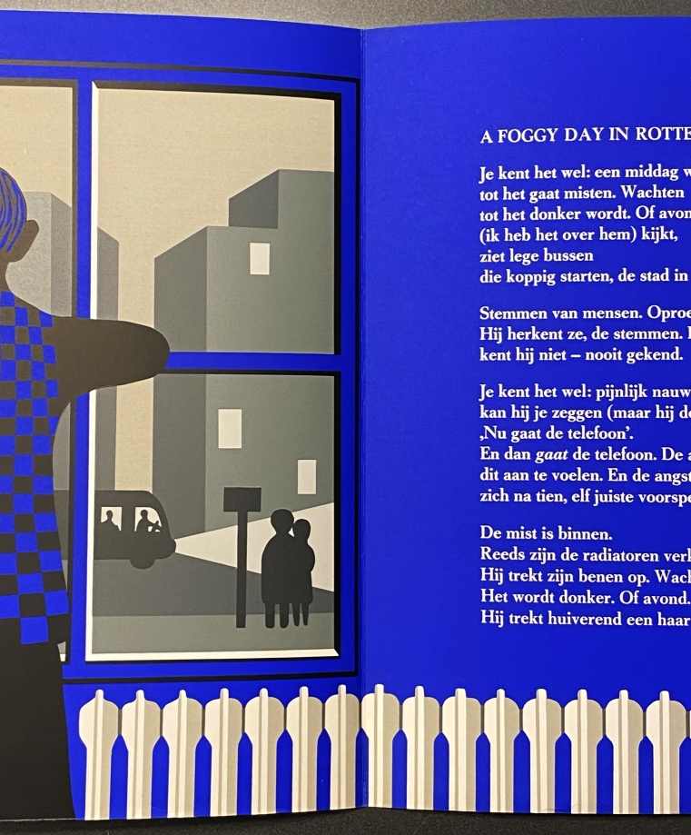 42. VAANDRAGER, Cornelis Bastiaan A foggy day in Rotterdam. (Met een zevenkleurige zeefdruk door Thijs Overmans). (Ulvenhout, Pen en Burijn, 1976). 30 x 24 cm. Vouwblad. Gedrukt door Piet Clement in een oplage van 200 genummerde en door de kunstenaar gesigneerde exemplaren op 300 grs. natuurkarton.