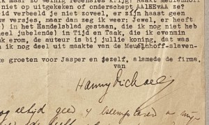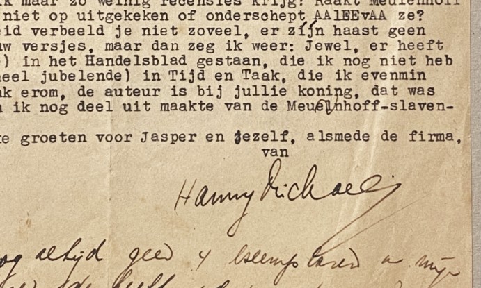 * Uitvoerige, persoonlijke, saillante brief aan een redacteur van uitgeverij Meulenhoff, waar Michaelis eerder dat jaar was gedebuteerd met de dichtbundel Klein voorspel. De dichteres dankt voor het toezenden van enkele besprekingen en ‘Je weet wel dat ik de gedichten zelf niet veel bijzonders meer vind, maar als men ze nu toch koopt, kan er wel een herdruk af, vind ik; schrijven is toch al zo’n armzalig beroep en dichten is nog droeviger’. Over het huis waar ze met Reve woont: ‘Ons huis is eindelijk een beetje gezellig geworden, dat vinden wij tenminste, misschien slaan jullie van ontzetting wel tegen de (deels gebeitste, deels on- planken) vloer als jullie een kijkje komen nemen’. Over W.F. Hermans: ‘Willem Frederik komt nog trouw bij ons eten, hij beklaagde zich laatst erover dat je zo nors tegen hem deed! Laatst hebben wij bij het echtpaar Morriën gegeten, waar ik verbijsterende indrukken omtrent Morriëns paedagogische instincten opdeed. Het is een zonderling man en vader, daar ben ik ondanks zijn zedig en zachtmoedig voorkomen, van overtuigd!’ En Michaelis hint ook op Werther Nieland: ‘Gerard heeft een novelle ondergebracht bij van Oorschot voor de Vrije Bladen; het zal wel in het najaar verschijnen. Alweer een wonderlijk verhaal uit ’s schrijvers tedere jeugd’. Een handgeschreven p.s. luidt: ‘Kan ik nog altijd geen 4 exemplaren van mijn gedichtjes tegen de helft van de prijs krijgen?’