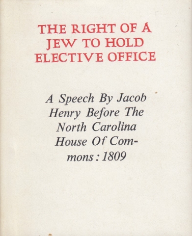 37. (MINI). WESTREICH, Budd The Right of a Jew to Hold Elective Office. A Speech by Jacob Henry Before the North Carolina House of Commons: 1809. Sacramento CA, Press of Arden Park, 1979. 84 x 70 mm. Linnen met stofomslag. (10), 30 p. Gedrukt in rood en zwart met illustraties in paars in 85 genummerde en gesigneerde exemplaren. 1e druk.