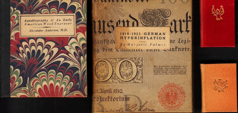 22. (MINIBOEKJE LEVIEN). PALMER, Marjorie 1918-1923 German Hyperinflation. New York, Traders Press-J.R. Levien, 1968. 75 x 65 mm. Karton bekleed met een origineel bankbiljet van 1000 mark uit 1910. 80 p. Geïllustreerd met foto’s en interessante tabellen. Bandje deels verbruind en met gebruikssporen.