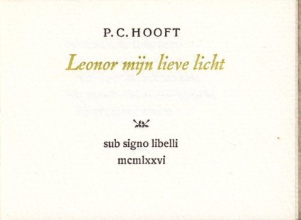 23. HOOFT, P.C. Leonor mijn lieve licht. Sub Signo Libelli, 1976. Oblong 6 x 8,5 cm. Ingenaaid met omslag. (16) p. Met de hand gezet en gedrukt in zwart en groen op Ingres d’Arches in een oplage van 40 genummerde exemplaren. De libel op het omslag, de libel aan het eind van de poëzie en de arcadische voortitel (naar Bewick) zijn in zomers olijfgroen gedrukt.