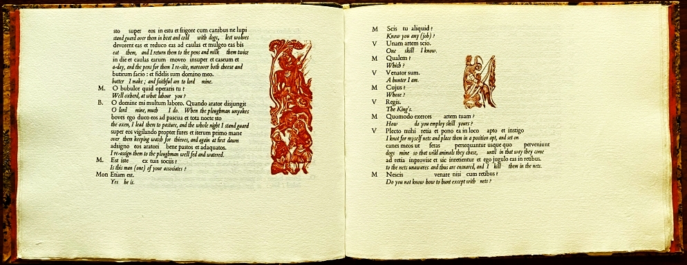 1. AELFRIC Aelfric’s Colloquy. Edited by Bill Griffiths. Market Drayton, Shropshire, Tern Press, [1978]. Oblong 20 x 27 cm. Halfleer met kurken platten. (44) p. Tweetalige uitgave met houtgravures van Nicholas Parry, gedrukt in bruinrood. Gezet uit de Poliphilus (Latijn) en de Blado (Engels) en gedrukt door Nicholas & Mary Parry op handgeschept papier van Hayle in 90 genummerde exemplaren. Leer wat verkleurd.