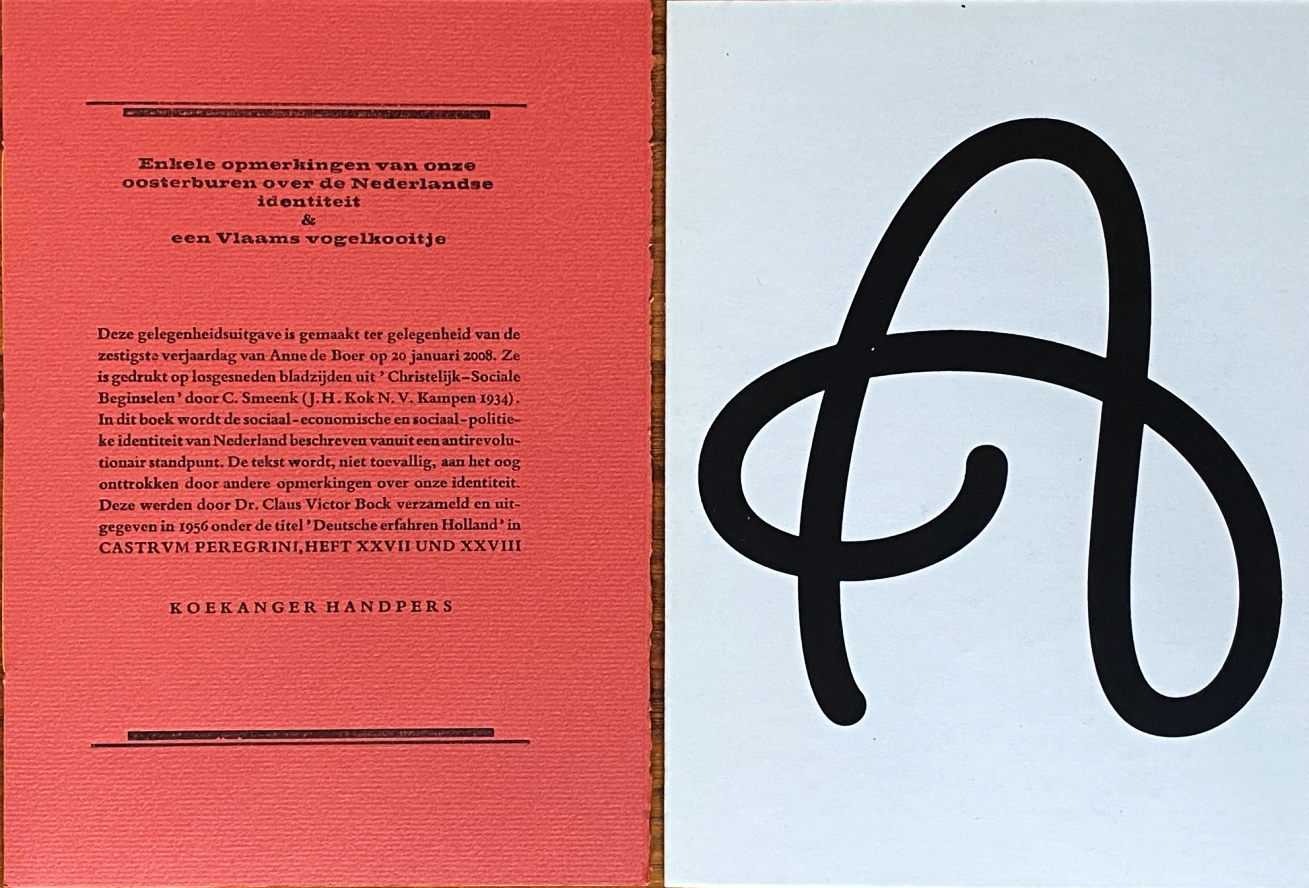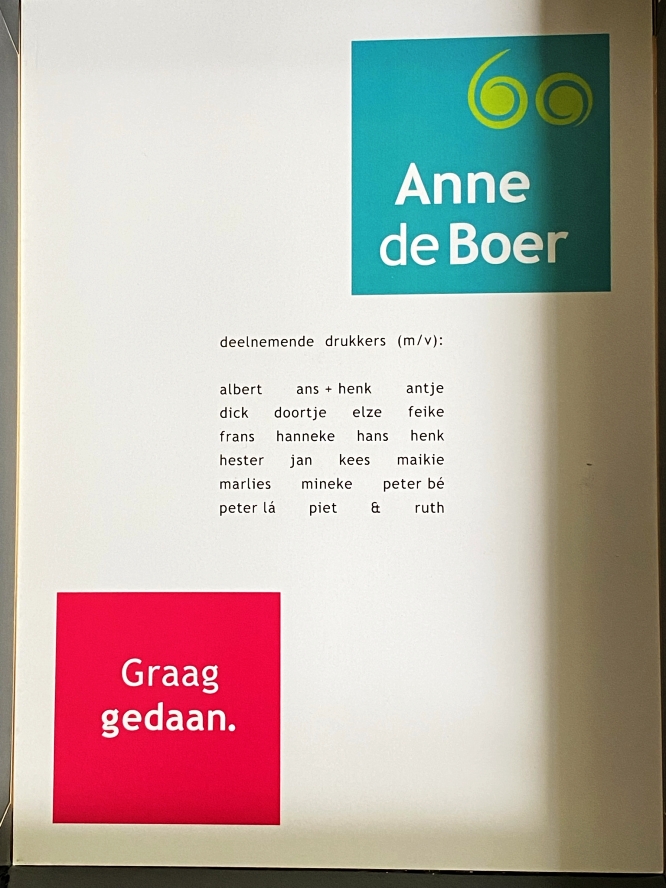 * Deze bibliofiele margedrukkersdoos verscheen ter gelegenheid van de zestigste verjaardag van Anne de Boer. Bevat bijdragen van Peter Bekker (Koekanger Handpers), Henk ter Bogt, Feike Boorsma, Albert Bouma, Frans den Breejen (Mikado Pers), Hanneke Briër, Elze ter Harkel, Ruth Hohe-Daan, Mineke Hollestelle, Hans Horn, Jan Keijser (Avalon Pers), Ans Koopmans & Henk van der Mey, Pater Lazarov, Marlies Louwes, Maikie Mijnssen, Piet Niemeijer, Dick Ronner (Triona Pers), Kees Thomassen (De Uitvreter), Antje Veldstra, Hester Verkruissen en Doortje de Vries (Eikeldoorpers).