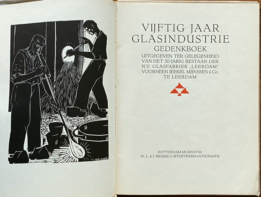 16. (COPIER, Andries, & H.P. BERLAGE, Karel WASCH e.a.) 50 jaar glasindustrie. Gedenkboek uitgegeven ter gelegenheid van het 50-jarig bestaan der N.V. Glasfabriek “Leerdam” voorheen Jeekel Mijnssen & Co te Leerdam. Rotterdam, Brusse, 1928. 25 x 19 cm. Ingenaaid. 136 p. Met frontispice in linosnede van Andries Copier en 55 p. illustraties op kunstdrukpapier aan het eind. Gedrukt in rood en zwart in 2000 exemplaren. 1e druk. Iets schuingelezen, heel lichte gebruikssporen.