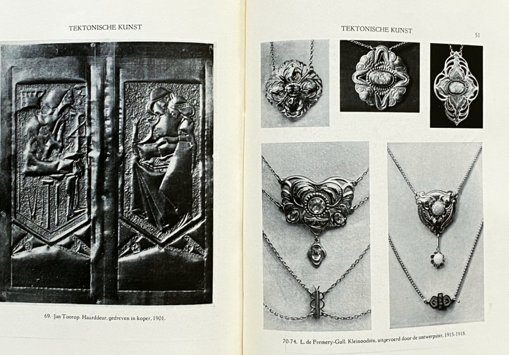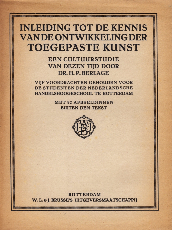 2. BERLAGE, H.P. Inleiding tot de kennis van de ontwikkeling der toegepaste kunst. Een cultuurstudie van deze tijd. Vijf voordrachten gehouden voor de studenten der Nederlandsche Handelshoogeschool te Rotterdam. Met vele afbeeldingen buiten den tekst. Rotterdam, W.L. & J. Brusse, 1923. 25 x 19 cm. Ingenaaid. 80, 64 p. Met 92 prachtige zwartwitfoto’s van toegepaste kunst. Inliggend het schier onmisbare prospectus met een overzicht van alle kunstenaars en de uitvoerende firma’s! 1e druk. Omslag langs de randen wat verbruind.