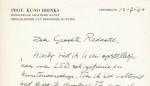 11. BRINKS, Kuno Handgeschreven brief aan ‘Zeer geachte Redactie’. Op papier met briefhoofd ‘Prof. Kuno Brinks/ Hoogleraar Grafische Kunst/ Rijksakademie van Beeldende Kunsten/ Amsterdam’. 21,8 x 14,0 cm. Gedateerd 12 juli 1964. Eenzijdig beschreven. 21 regels. Horizontale vouw, mooi.