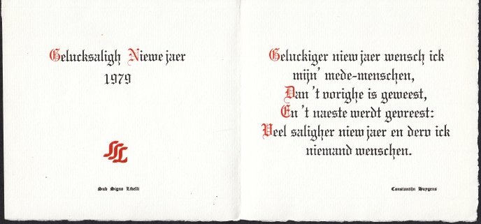 24. HUYGENS, Constantijn Geluckiger niew jaer. Sub Signo Libelli, 1979. 12 x 13 cm. Vouwblad van geschept papier. Met de hand gezet uit een gotisch lettertype en gedrukt in rood en zwart.