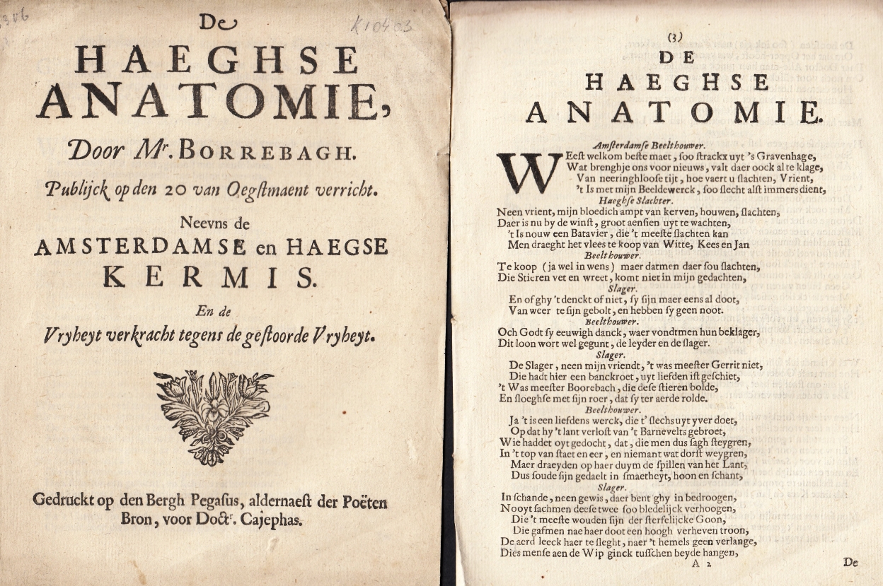28. (MOORD OP DE GEBROEDERS DE WITT) De Haeghse anatomie, door Mr. Borrebagh. Publijck op den 20 van Oegstmaent verricht. Neevns de Amsterdamse en Haegse kermis. En de Vryheyt verkracht tegens de gestoorde Vryheyt. Zonder plaats of uitgever, maar: ‘Gedruckt op den Bergh Pegasus, aldernaest der Poëten Bron, voor Doctr. Cajephas’, [1672]. Pamflet zonder omslag. 12 p. Wat grauw, pagina’s los, kleine kreukjes en scheurtjes.