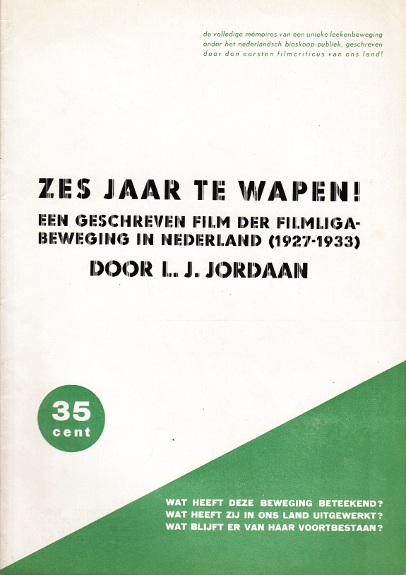 31. JORDAAN, L.J. Zes jaar te wapen! Een geschreven film der Filmliga-beweging in Nederland (1927-1933). [Rotterdam, Nijgh & Van Ditmar, 1933]. 29 x 21 cm. Geniet. 36 p. Met foto’s en fotomontages. 1e druk. Rugje iets gebarsten, maar in mooie conditie.