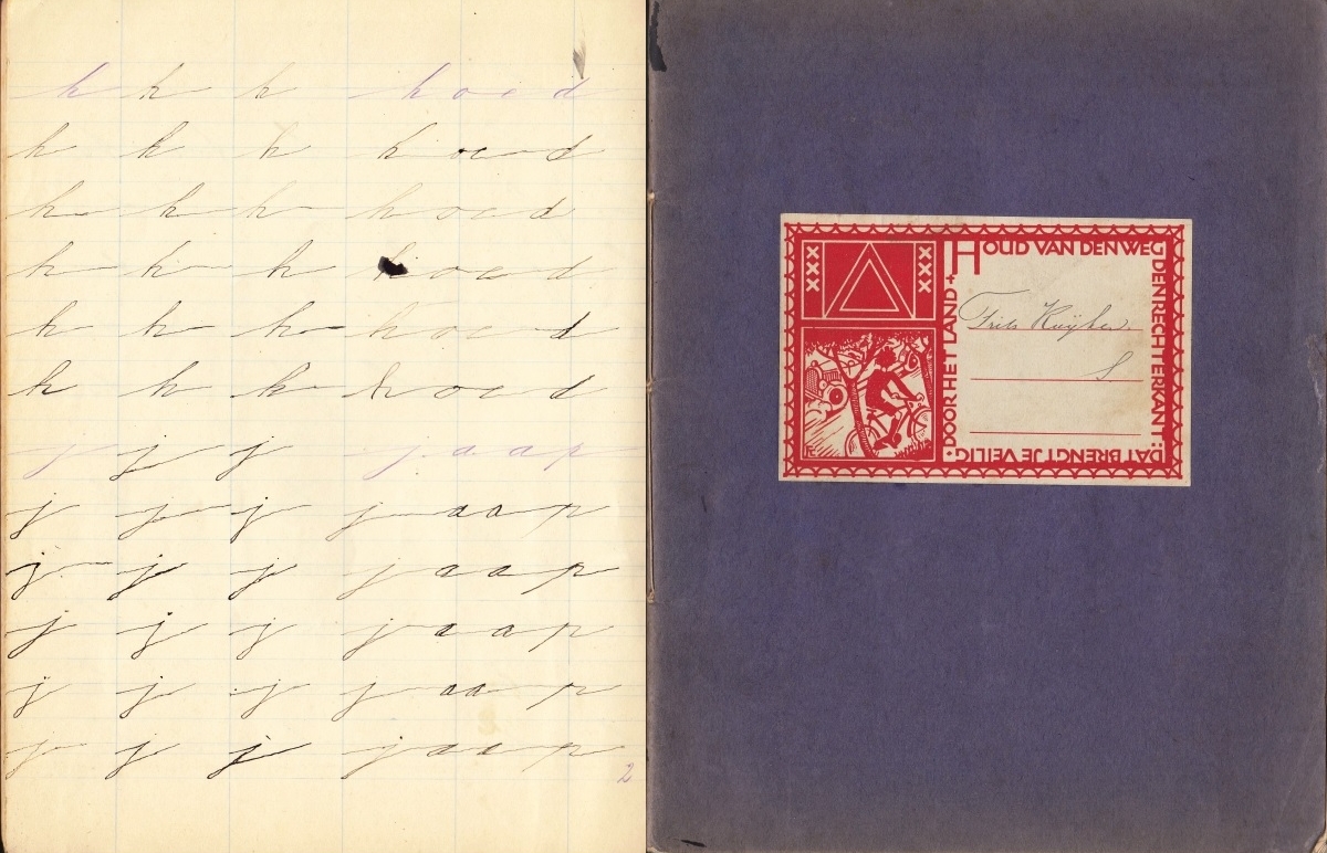 18. COHEN, Fré ‘Houd van den weg den rechterkant: … Dat brengt je veilig door het land.’ Gebruikt schoolschrift met opgeplakt etiket (6,5 x 10 cm), gedrukt in rood, naar ontwerp van Fré Cohen. Eenvoudig paars schrift van ene Frits Kuijken voor de Lagere School, volgeschreven met eenvoudige schrijfoefeningen – eerst losse letters, dan hele woorden – in het jaar Onzes Heren 1932.