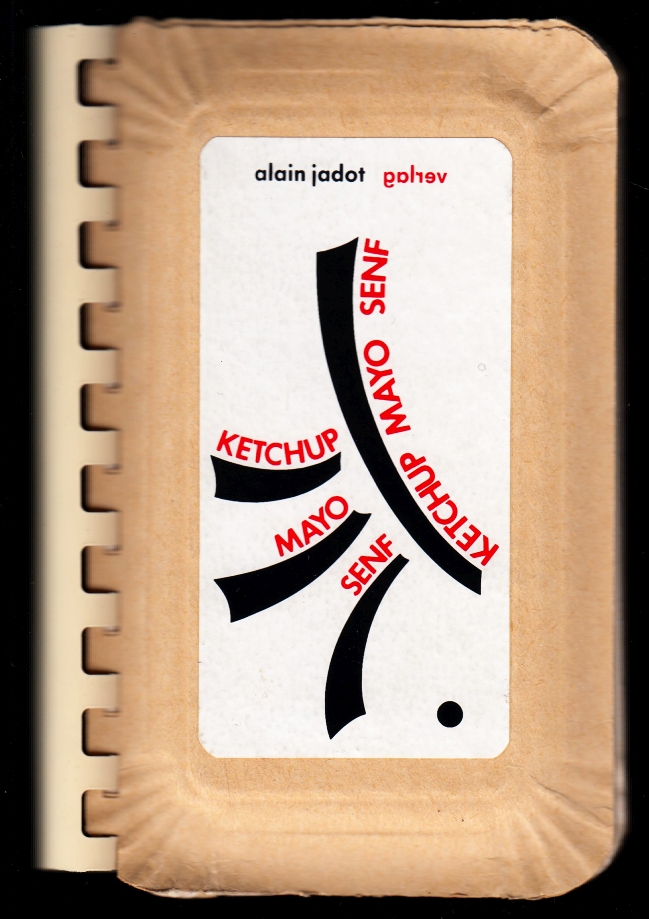 28. JADOT, Alain Ketchup. Mayo. Senf. Berlijn, Alain Jadot Verlag, 1988. 9 x 15 cm. Plastic spiraalbandje. 13 worstkartonnen bladen met reliëf en 23 opgeplakte etiketten. Frontispice: een ingeplakt plastic wegwerpvorkje. In het Duits. 1e druk. Netjes.