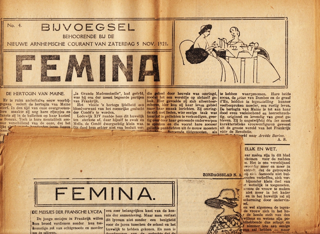 24. (FEMINA). NIEUWE ARNHEMSCHE COURANT Femina. (Bijlage voor de vrouw, 1921-1922). Arnhem, Nieuwe Arnhemsche Courant, 1921-1922. 11 Zaterdagbijlagen en 7 (kleinere) zondagbijlagen. Gevouwen katernen. In oud halflinnen mapje met linnen. Wat brokkelig, papier vergeeld. Uit het Kerstnummer 1921 is een groot stuk geknipt.