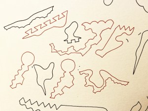 * Twaalf gedichten van Vlaamse en Nederlandse dichters: H.H. ter Balkt, Frans Denissen, Christine D’Haen, Stefan Hertmans, Marcel van Maele, René Oey, Hanny Rouweler, Hanneke van Schooten, Frans Struik, Willem M. Visser en Jan Zitman. Deze zijn met het door Guy Rombouts en Monica Droste uitgevonden Azart-alfabet vertaald en in dit verbazende, grote boek afgedrukt. Het Azart-alfabet bestaat uitsluitend uit lijnen en symbolen in kleuren, in dit boek weergegeven als rood en zwart. Op twee losse bijlagen, een enkel en een gevouwen blad, zijn de karakters respectievelijk de twaalf gedichten in het Latijnse alfabet weergegeven. Het resultaat is wonderschoon.
