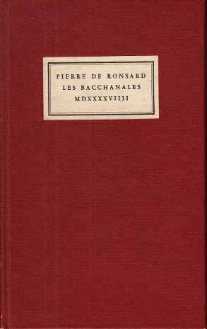 40. (TERBORGH, F.C.). RONSARD, Pierre de Les Bacchanales ou le folastrissime voyage d’Hercueil pres Paris dedié a la joyeuse trouppe de ses compaignons fait l’an 1549 par Pierre de Ronsard Vandomois. (Met een nawoord door H. de la Fontaine Verwey). Amsterdam, Non Pareil, 1953. 13 x 9 cm. Karton met titeletiket. 56 p. Gedrukt door Joh. Enschedé en gezet uit de cursieve Spectrum naar typografie van Jan van Krimpen.