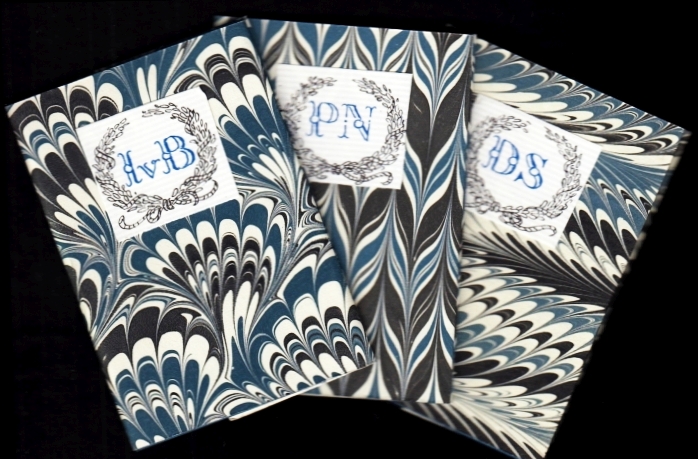 13. BROEKHUIZEN, Johan van, Pieter NIEUWLAND & Dirk SMITS Eenige galanterieën. (Drie miniboekjes in foedraal). Utrecht, De Utrechtsche, 1980. 75 x 53 mm. Drie geniete boekjes met marmeromslagje, samen in fluweelbekleed foedraal. Elk boekje bevat een frontispice en enkele galante gedichten uit de 18e eeuw. Gedrukt in ruim 300 genummerde exemplaren. 1e uitgave. Fraaie staat.