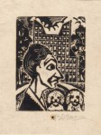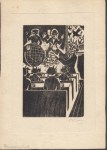 17. COHEN, Fré Exlibris voor Koos Vorrink. [1926]. Op gevergeerd papier. Bladformaat 95 x 65 mm. Beeldformaat 78 x 54 mm. Houtsnede, in het hout gesigneerd ‘FC’. Op een stukje dik karton geplakt. Kleine roestvlekjes.