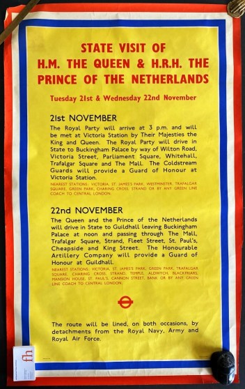 37. STAATSBEZOEK 1950 State Visit of H.M. the Queen & H.R.H. Prince of the Netherlands. Tuesday 21st and Wednesday 22nd. (Poster). Londen, London Transport, [1950]. 101 x 63 cm. Grote affiche gedrukt in rood, geel, blauw en zwart. Alleen tekst in kleurig frame plus vignet van London Transport. Opgerold. Enkele kleine scheurtjes aan de randen, rechtsonder is een verticale reep van enkele millimeters breed afgeknipt, maar verder in zeer goede staat.