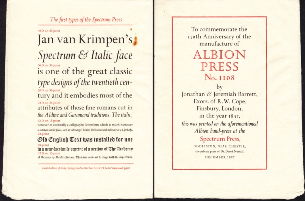 32. (NUTTALL, Derek) To commemorate the 150th Anniversary of the manufacture of Albion Press No. 1108 by Jonathan & Jeremiah Barrett, Exors. of R.W. Cope, Finsbury, London, in the year 1837, this was printed on the aforementioned Albion hand-press at the Spectrum Press, Dodleston, near Chester, the private press of Dr. Derek Nuttall, December 1987. Dodleston, Spectrum Press, 1987. 26 x 19 cm. Gevouwen vel Barcham Green’s ‘Chester’-papier, in vier pagina’s eenzijdig in rood en zwart bedrukt, in een oplage van 30 exemplaren. Met ingeplakte originele zwartwitfoto van de pers, een technische historie en verklaring van het materiaal, en een letterproef van het beschikbare materiaal van de lettertypen Spectrum romein en cursief en Old English Text. Achterop een roestvlekje.
