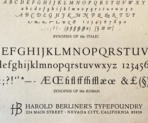 * Een koker als een Russische pop, bedoeld om Huib van Krimpen in kennis te brengen van de aan zijn vaders tekst ontleende poster. Harold Berliner (1923-2010) was een Californische ‘district attorney’ ofwel officier van justitie, overigens een van de auteurs van de Miranda Warning in 1966, maar zijn hart lag bij het drukken en uitgeven van schone letteren en na zijn pensionering wist hij de omvangrijkste lettergieterij in particulier bezit ter wereld te bijeen te brengen. Een deel van zijn werk is nog steeds nieuw te koop.