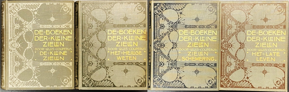 19. COUPERUS, Louis De boeken der kleine zielen. (I. De kleine zielen; II. Het late leven; III. Zielenschemering; IV. Het heilige weten). Amsterdam, Veen, [1901-1903]. 4 delen. Linnen (bandontwerp Theo Neuhuys). (4), 268, (4), 252; (4), 180, (4), 184; (4), 192, (4), 216; (4), 220, (4), 224 p. 1e druk. Deel I en IV wat scheefgelezen. In deze set is De kleine zielen nu eens opvallend gaaf (meestal is dat de zwakke schakel in de vier delen). Opvallend weinig roest. Met op de binnenzijde van het voorplat van deel I en IV het kleine exlibris van Dick Laan (auteur van Pinkeltje): een naakte jongeling die een boek leest, leunend op een grote schedel.